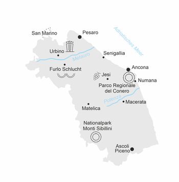 Neben den Ausflügen in das hügelige Landesinnere und die bedeutenden kulturellen Stätten führt unsere Entdeckungsreise aber auch direkt ans Meer, wo wir u.a. den typisch italienischen Badeort Senigallia besuchen werden. Darüber hinaus erkunden wir den schönen Küstenabschnitt des Monte Conero auch direkt von der Seeseite aus: in Numana besteigen wir ein kleines Boot und erleben abgelegene Buchten mit so herrlichen Namen, wie „die zwei Schwestern“ oder auch „das Segel“.